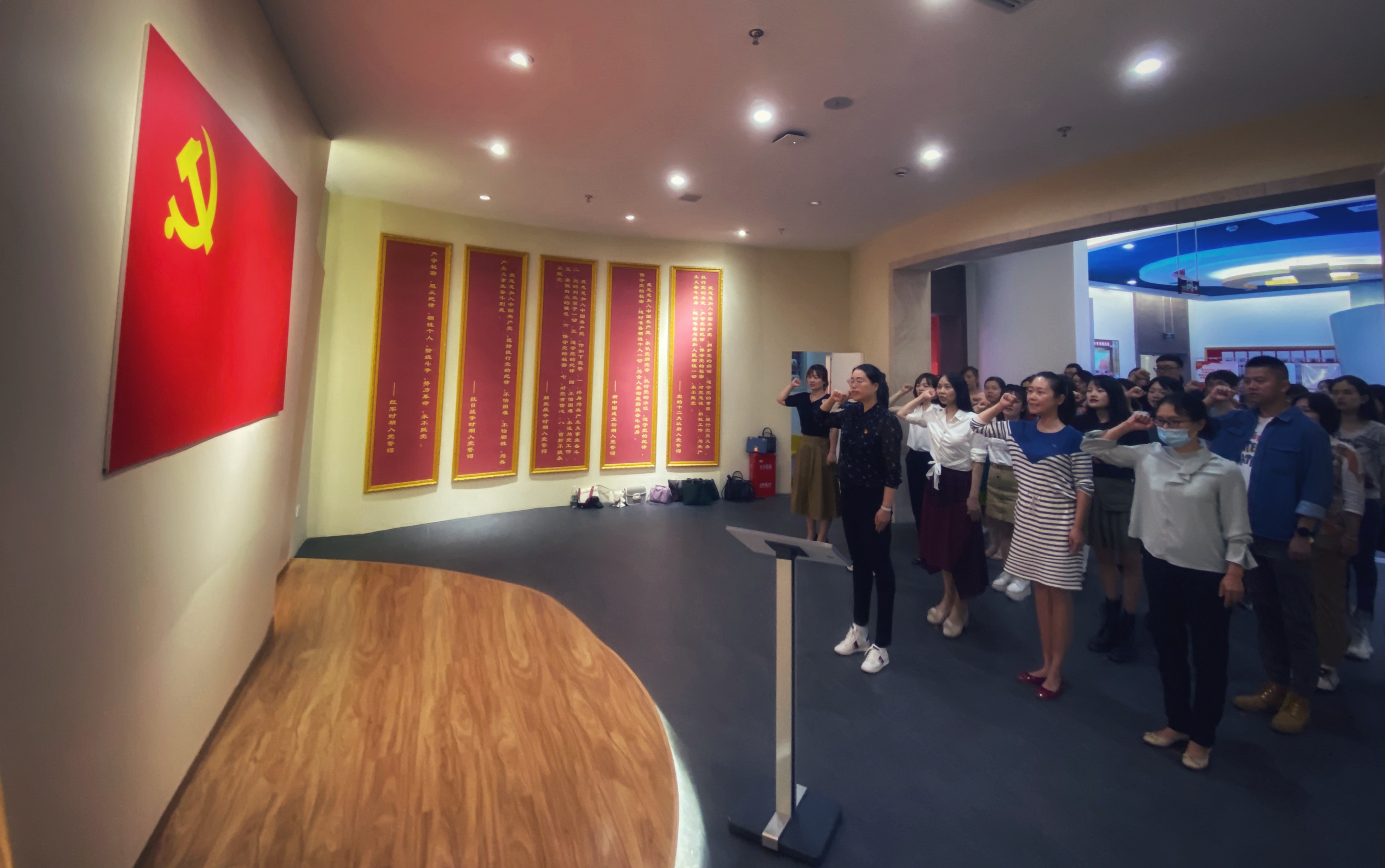 在党性教育的浸润后,正值党员教师们备受鼓舞之际,公司党总支书记冯良亮同志带领大家再次重温入党誓词。鲜红的党旗下,党员教师们庄严地举起右手,握拳宣誓,再次接受了心灵的洗礼,更加坚定对党的事业奋斗终身的决心和愿望。