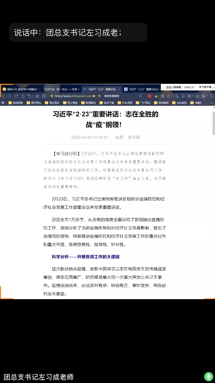通过本次学习使广老员工干部学习了习总书记的讲话,同时也明白了投身一线的志愿者们的无私,同时自身的安全意识也得到了加强,相信在以习近平总书记为核心的领导下,这场人民战争会早日结束!