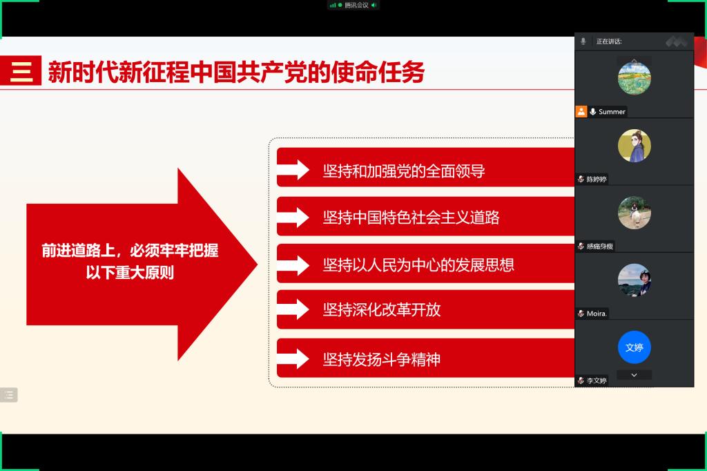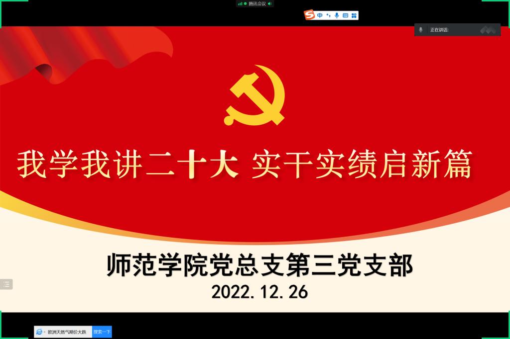 12月26日,新冠肺炎疫情来势汹汹,打破幸福平静的生活。在此特殊情况下,为深入学习贯彻党的二十大精神,进一步激发全体党员爱党爱国情怀,保证疫情防控与党建活动两不误,yl7703永利公司党总支第三党支部将主题党日活动搬到线上开展,于12月26日进行以“我学我讲二十大 实干实绩启新篇”为主题的线上主题党日活动。活动由支部书记夏椰柯主持,全体党员教师准时参加。