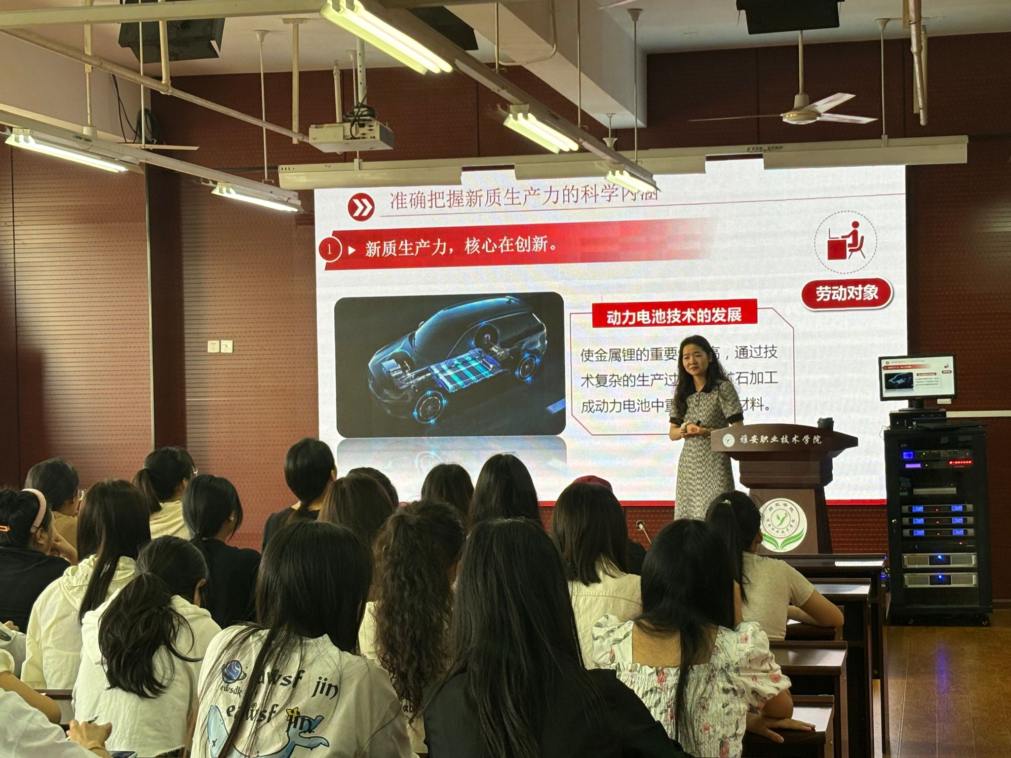 李月夏老师从四个方面由浅入深、由理论到实践、由宏观到微观为同学们解析“新质生产力”内涵,引导同学们思考发展新优势的前景。首先,准确把握新质生产力的科学内涵,以简单生动的方式与员工一同探讨生产力是什么、新质生产力的核心等,为员工进行解答;其次,通过新质生产力的内涵引导员工充分认识发展新质生产力的重大意义;然后,立足yl7703永利集团员工师范生专业特性及师范生核心素养提升,与同学们一同探索发展新质生产力的专业实践途径;最后,聚焦雅安发展,集合宏观经济发展状态和个人生活情况,与员工一同畅想雅安市探索发展新质生产力的实践路径。