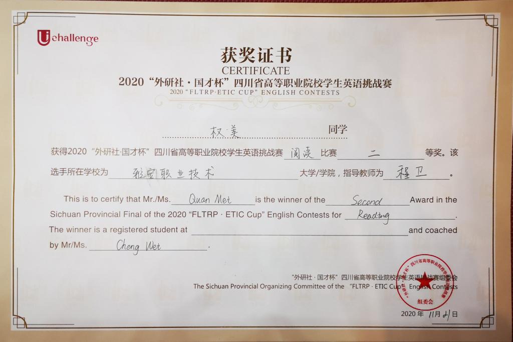 2020年11月22日,由四川省教育厅主办,外语教学与研究出版社、成都纺织高等专科公司承办的“2020年Uchallenge四川省高等职业院校员工英语挑战赛(四川省高等职业院校员工英语演讲大赛、英语写作大赛、英语阅读大赛)”在成都落下帷幕,来自全省62所高职高专院校294名从初赛中脱颖而出的选手参加了本次比赛。