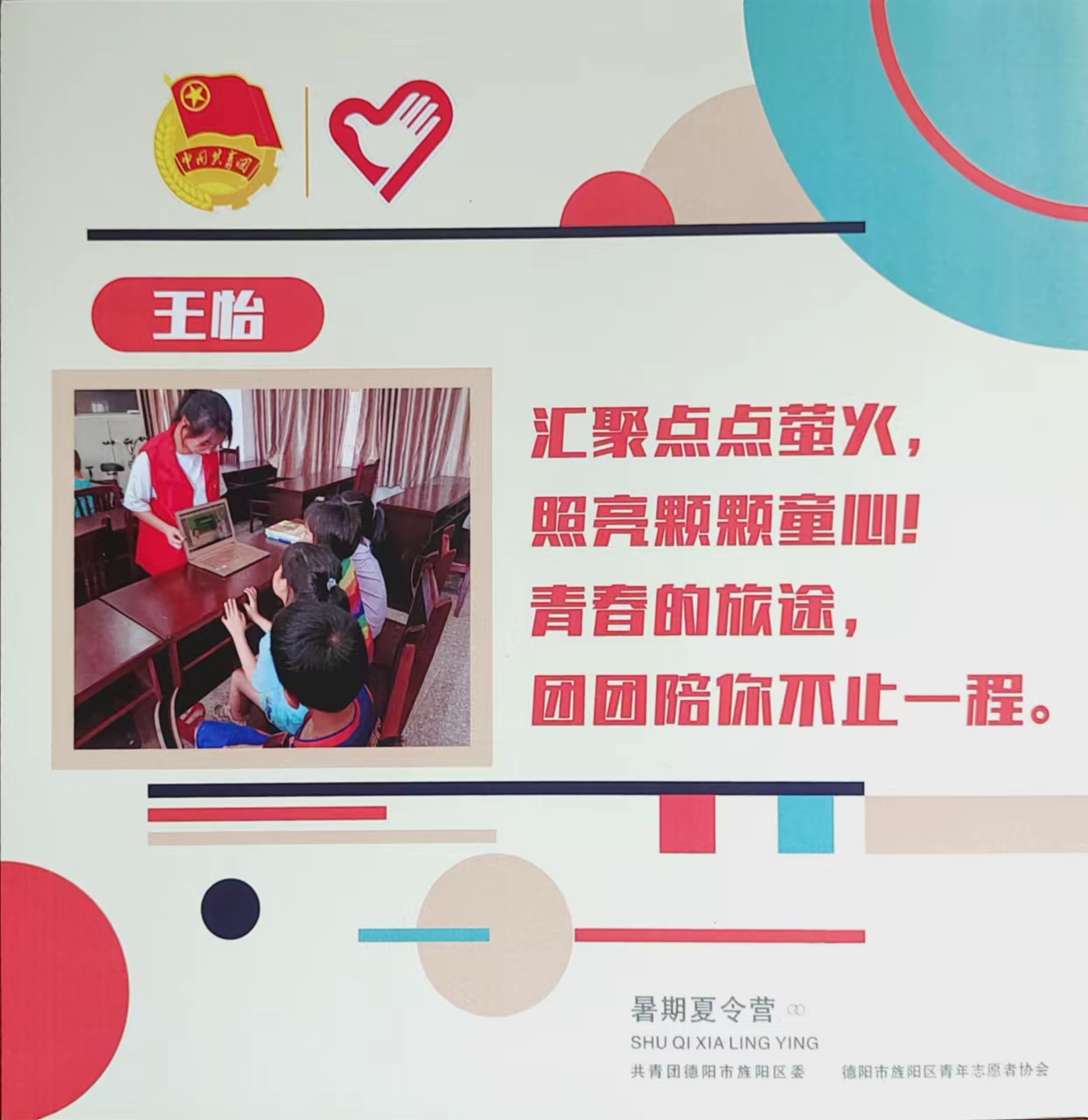 这个暑期,在参与“逐梦计划”前后,王怡还参加了由共青团德阳市旌阳区委组织开展的为期五天的“关爱一夏”暑期夏令营活动,走进黄许镇三合村“儿童之家”,参与了儿童安全教育、教唱歌曲、宣讲党的知识、性教育及开设艺术特色课程等系列志愿服务活动,并被评为“暑期夏令营优秀青年志愿者”。同时,在8月25日的全国残疾预防日,她以德阳市旌阳区残联的联盟服务组织“微光公益”的志愿者身份,给社区的残疾人打慰问电话,开展残疾人生活及文化体育爱好调研,一共打出120个电话。