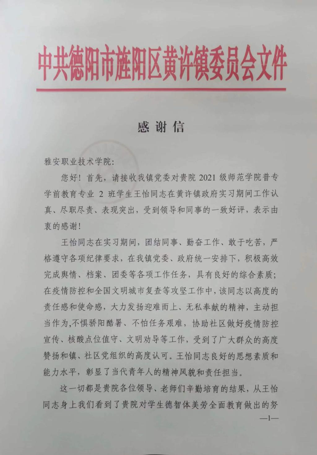 “王怡同志良好的思想素质和能力水平,彰显了当代青年人的精神风貌和责任担当。”近日,公司收到德阳市旌阳区黄许镇党委发来的一封表扬信,信中对yl7703永利集团学前教育专业2021级2班员工王怡于2022年暑假期间,在参与舆情监测、档案整理、疫情防控、全国文明城市复查等工作中的表现给予了高度肯定。