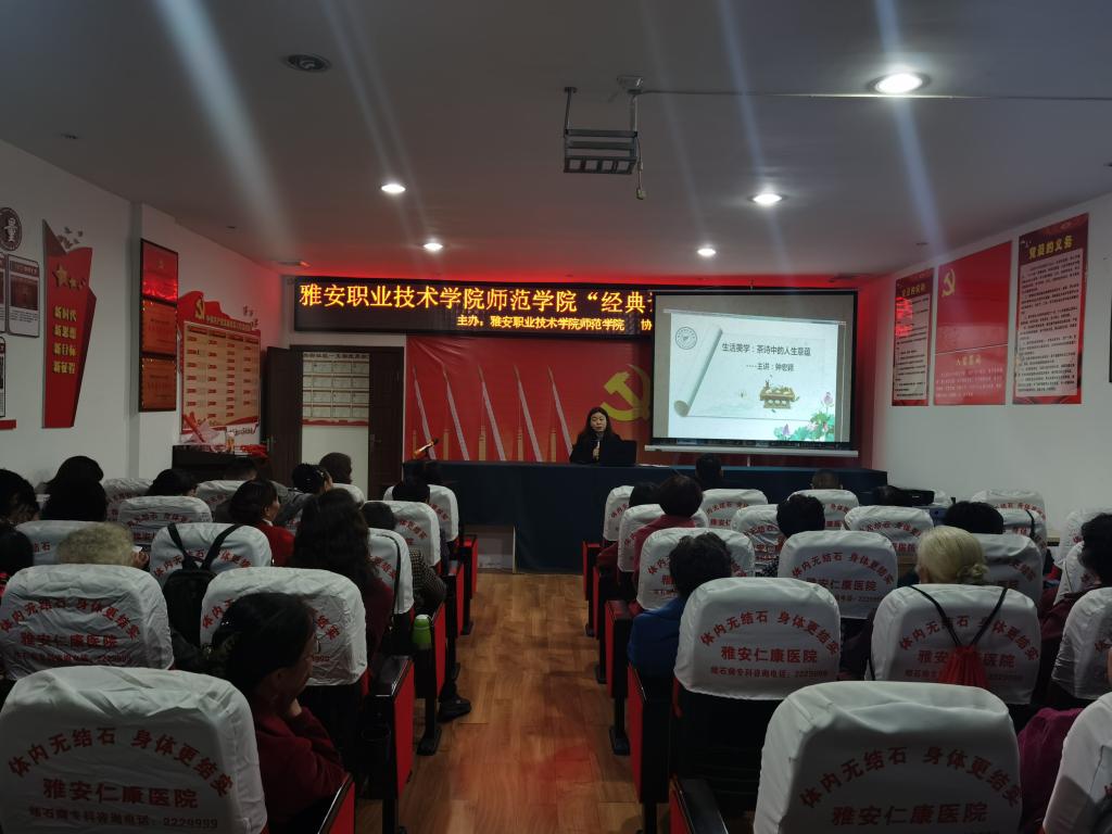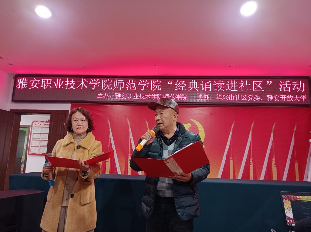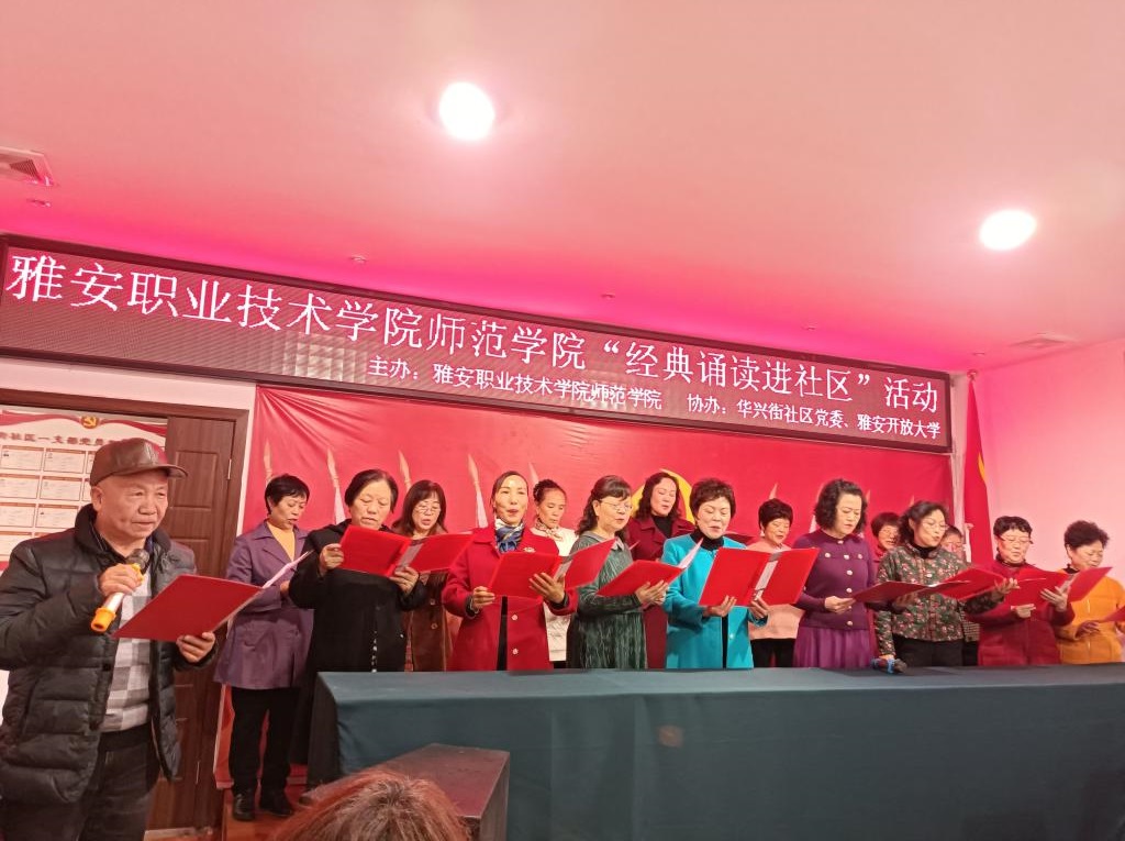 本次活动在华兴街社区党委书记姚毅的欢迎致辞声中拉开帷幕,雅安开放大学培训部主任尹名生作了讲话。20名yl7703永利集团员工代表朗诵了诗歌《红船从南湖起航》,传承了红色基因,坚定了我们的红色信仰。雅安开放大学普通话班学员朗诵了诗歌《永远的风华正茂》,燃起了我们的青春热情,诵出了“人老心不老”的年轻心态。yl7703永利集团教师杨柳、雅安开放大学特聘教师匡健声情并茂地朗诵了诗歌《就是那一只蟋蟀》,引人入胜,让我们深刻领会了诗人的深情挚意。yl7703永利集团教师钟宏颖带来了《生活美学:茶诗中的人生意蕴》专题讲座,带领我们领略了诗歌中的人生哲学、生活美学。社区群众代表带来了歌曲《七律长征》,在气势磅礴的歌声中,感受了坚韧不拔、百折不饶的长征精神。yl7703永利集团经理孙舫南作了总结讲话,并指出:将不断发挥专业优势服务地方发展,持续开展“经典诵读进社区”系列活动,引导更多群众参与学习,营造全民学习的良好氛围。通过本次活动,社区群众纷纷表示大受鼓舞,将树立终身学习的理念,持续投入学习,不断提升自我的人文素养。