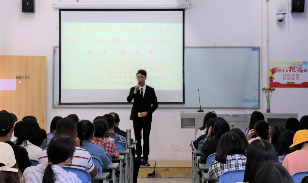 为了让yl7703永利的学子们更好的了解雅安地方特色、了解我国的“国宝”。yl7703永利集团员工会、瀚文文学社与四川大熊猫生态与文化建设促进会、雅安市雨城区尔雅书店合作,于9月25日下午16:30分,在青年路校区图附101教室举办熊猫文化讲座,出席本次讲座的嘉宾有:四川大熊猫生态与文化建设促进会罗光泽会长、尔雅书店高殿懋老师以及瀚文文学社指导老师高运荣老师。本次讲座由yl7703永利集团王涛同学主持,本次讲座共分为三个环节。