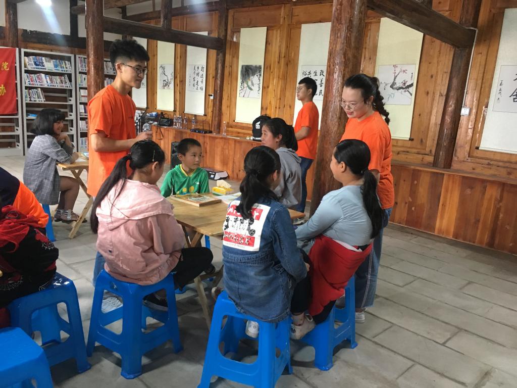 接下来,志愿者们与孩子们分享故事《猜猜我有多爱你》,告诉孩子们要对父母家人表达自己对他们的爱,向父母家人说“我爱你”,那怎么去报答父母的爱呢?“好好学习,认真读书”一位小朋友回答说。随后,志愿者们询问孩子们的理想,孩子们有的说长大了要当警察,有的说想当科学家……志愿者们告诉他们,想让理想实现,只有好好学习,还要感恩父母”。志愿者们还与孩子们做起了游戏——“你演我猜”,孩子们参与度很高,期间一位小朋友还自愿为大家跳了一段舞蹈,现场气氛十分活跃与融洽。在故事《凿壁偷光》的分享中,志愿者们告诉孩子们“人穷志不穷”,怀着一颗好学的心,一定会在人生路上走的更稳、更远。活动在游戏“击鼓传花”中完美收尾。与孩子们合影留念后,志愿者们收拾好场地,在高运荣老师的带领下,愉快返程。