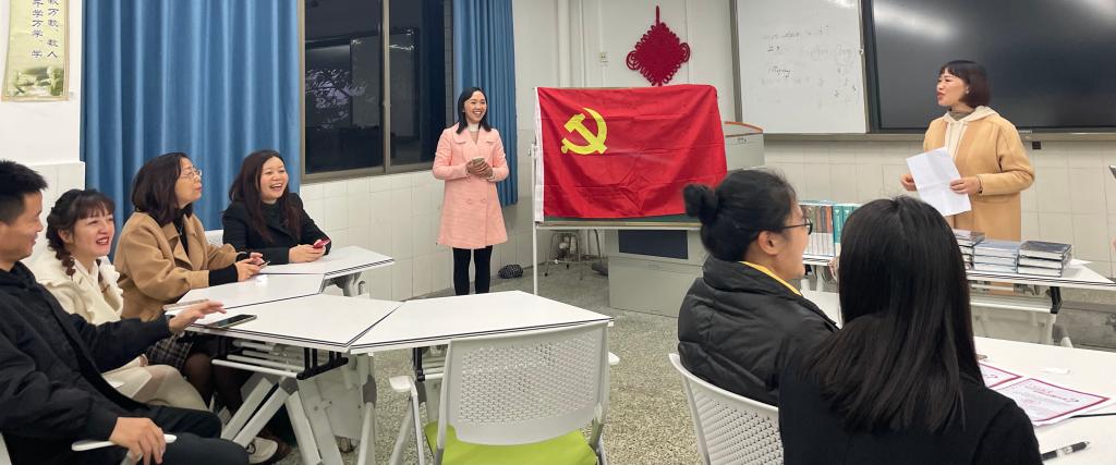 “知识竞赛”由支部纪检委员王瑜主持,支部党员教师分为“自信自强组”和“守正创新组”,竞赛题目紧紧围绕二十大提出的新思想、新目标等主题,设置个人必答题、小组抢答题,及“唱支山歌给党听”附加拓展题,共三个环节。党员老师积极参与,机智抢答,赛出了党员教师的深厚理论功底,唱出了对党和国家的深沉热爱。其中,“自信自强组”以1分的优势获得胜利,程卫老师获“答题达人”称号。